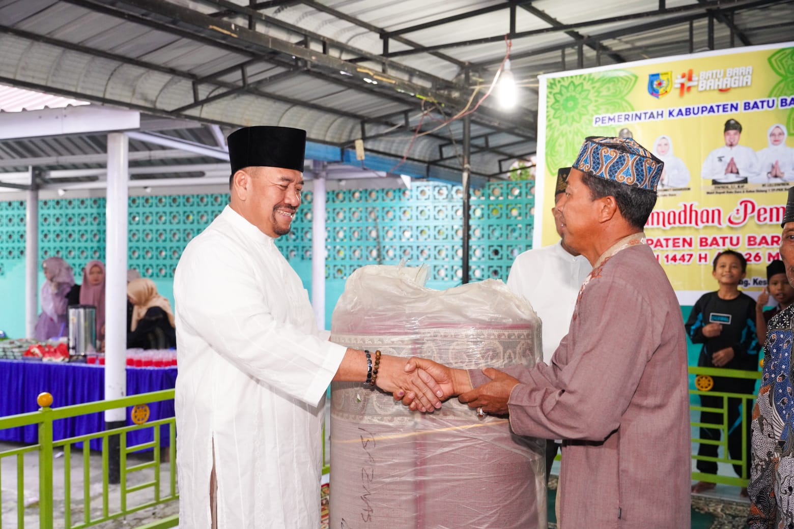 Pada kesempatan tersebut, Bupati Batu Bara juga menyerahkan bantuan sembako dan tali asih kepada anak yatim piatu sebagai bentuk kepedulian dan perhatian pemerintah terhadap masyarakat yang membutuhkan. Selain itu, bantuan berupa ambal shalat turut diberikan kepada BKM Masjid Al-Ikhlas guna mendukung kenyamanan beribadah.
