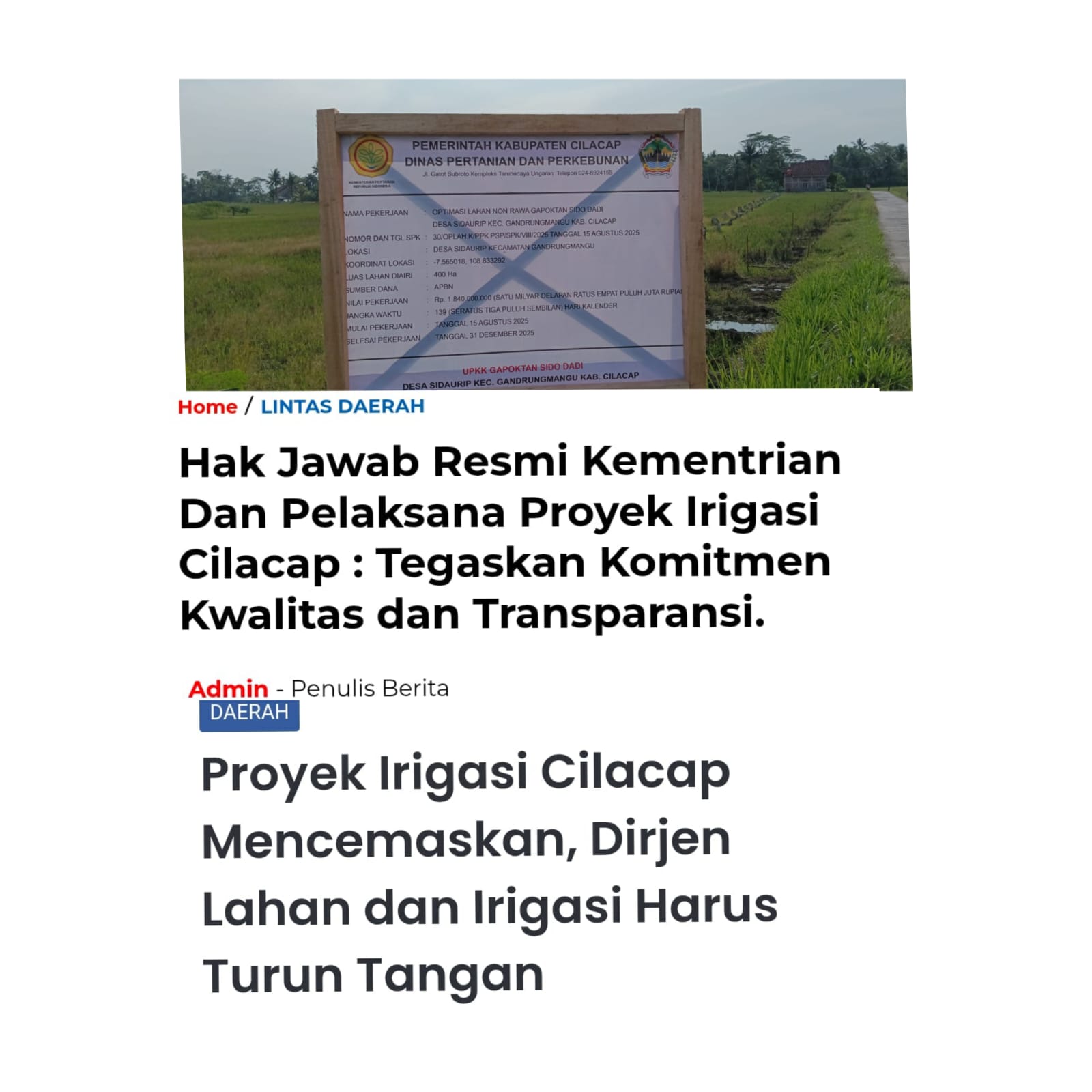 Diduga adanya Berita yang menyesatkan Publik dengan judul “Hak Jawab Resmi Kementerian dan Pelaksana Proyek Irigasi Cilacap : Tegaskan Komitmen Kwalitas dan Transparansi” tentu ini diduga menyesatkan Publik. Yang mana “Hak Jawab Resmi Kementerian” apakah betul yang memberikan hak jawab tersebut adalah Juru bicara Kementan yang memiliki Surat Keputusan Resmi Sebagai Pegawai Negeri Sipil yang memiliki Jabatan Kepala Biro Hubungan Masyarakat dan Informasi Publik Kementerian Pertanian. Kita berharap penulis berita dapat menunjukan surat resmi dari Kementan bahwa statemen itu resmi.