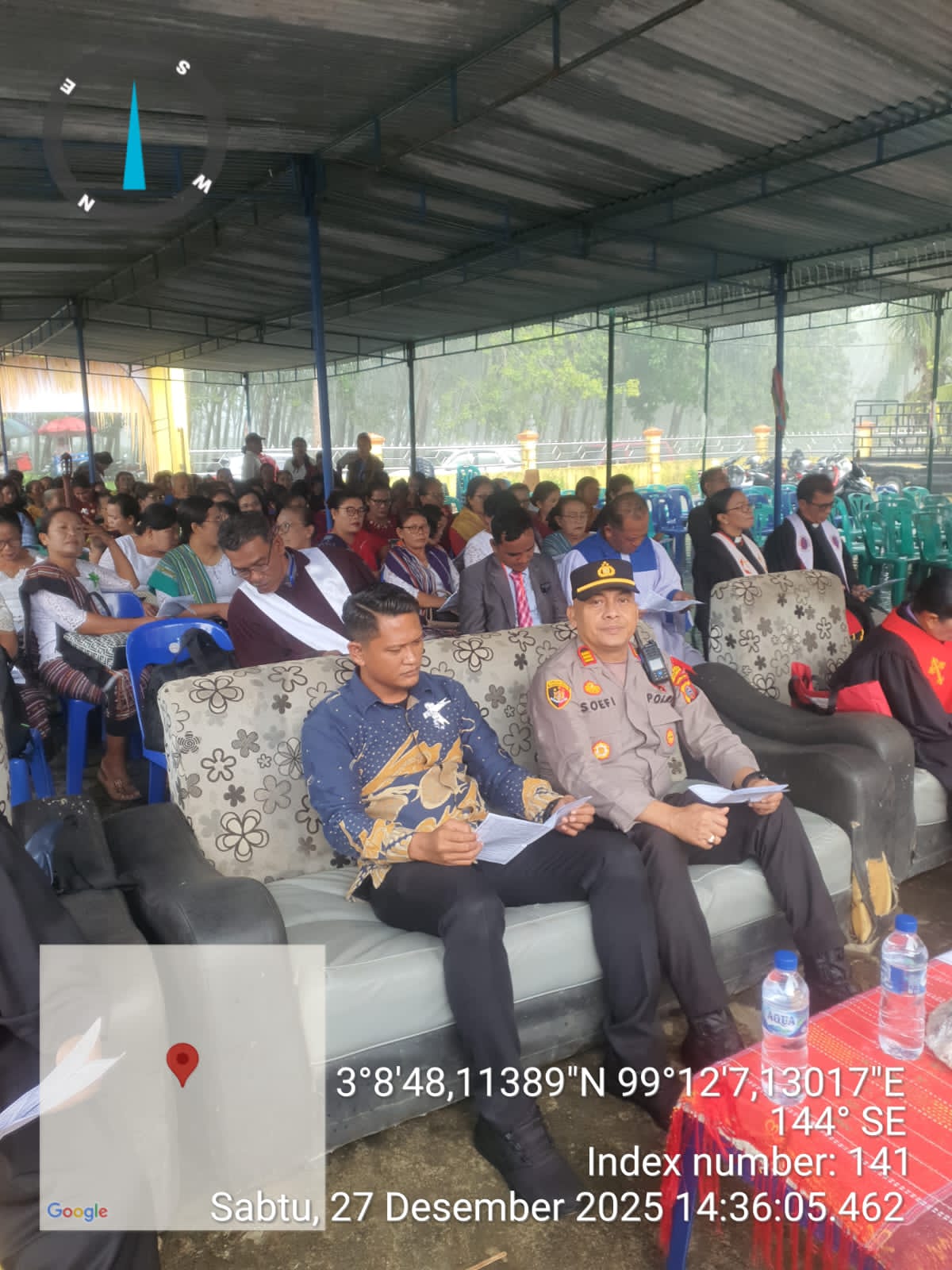 Central Publikasi.Com-Simalungun Kepedulian mendalam terhadap korban bencana alam terpancar dalam Perayaan Natal Oikumene Kecamatan Bandar Huluan. Kapolsek Perdagangan AKP Ibrahim Soepi, SH, MH., bersama Kanit Samapta AIPTU James Simanjuntak, SH., menghadiri perayaan Natal sekaligus doa bersama untuk korban bencana alam di Sumatera Utara, Sumatera Barat, dan Aceh pada Sabtu (27/12/2025) di Halaman Gereja HKBP Aek Nauli, Nagori Naga Jaya II, Kecamatan Bandar Huluan.