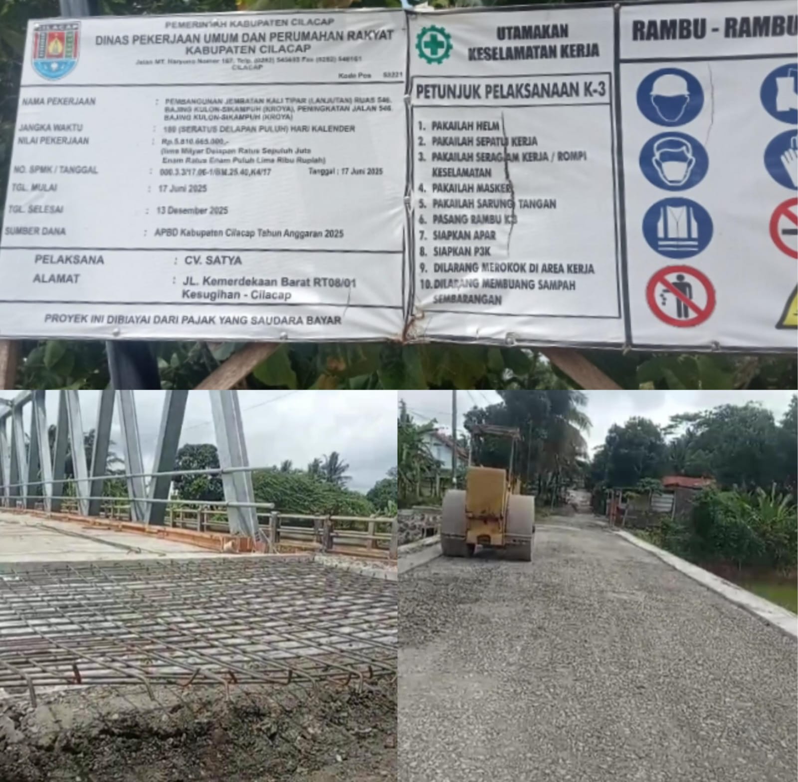 Central Publikasi.Com-Cilacap:Dari laporan masyarakat yang tidak mau disebutkan namanya, ia menceritakan ada proyek pembangunan infrastruktur Jembatan dan jalan sedang menjadi sorotan, pasalnya kegiatan pembangunan jembatan kali tipar (Lanjutan) ruas 546 bajing kulon-sikampuh (Kroya). Nilai Kontrak Rp.5.810.665.000,- nomor kontrak 000.3.3/17.06-1/BM.25.40,K4/17. Tanggal selesai 13 Desember 2025. Sumber Dana APBD Kabupaten Cilacap. Pelaksana CV. Satya.