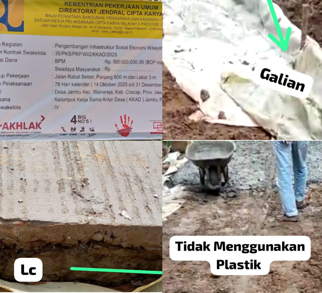 Dari hasil konfirmasi dengan G. G menjelaskan kepada Tim Media bahwa Jalan Rabat Beton. Yang sedang dibangun ini adalah jalan tembus antara Desa Jambu dan Palugon. Dengan ukuran Panjang 800M dan Lebar 3M. Mengunakan FC 17 atau mutu beton kurang dari K200, tebal jalan rabat beton 15CM tanpa mengunakan LC(Lean Concrete)beton kurus atau lantai kerja, yang tentunya lebih rendah mutunya beton. G juga menjelaskan kepada Tim Media FC 17 dengan Agregat