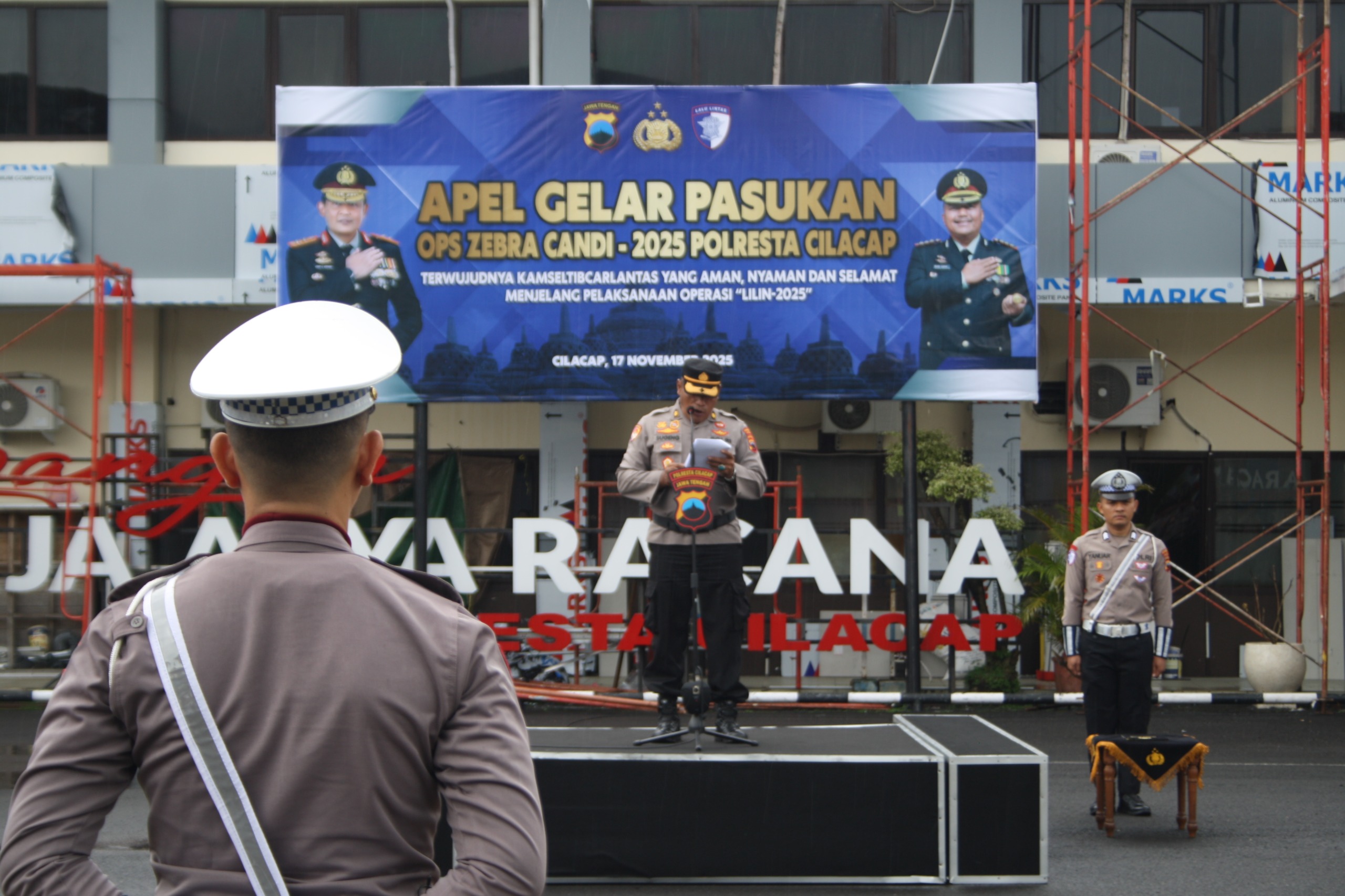 Central Publikasi.Com-Cilacap;Polresta Cilacap menggelar Apel Pasukan Operasi Zebra Candi 2025 di Lapangan Apel Polresta Cilacap. Apel dipimpin Kabagren Polresta Cilacap Kompol Sugeng Hartono mewakili Kapolresta Cilacap yang berhalangan hadir, apel ini turut di ikuti seluruh personel lintas fungsi serta unsur terkait seperti Dishub, Satpol PP, dan Saka Bhayangkara, Senin (17/11/2025) pagi