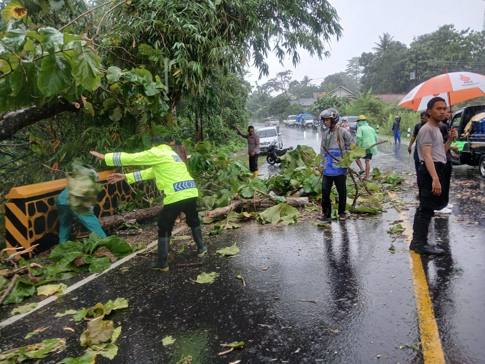 Peristiwa tersebut terjadi sekitar pukul 10.30 WIB saat hujan deras mengguyur wilayah setempat. Sebuah pohon jati milik Perhutani tumbang dan menghalangi jalur utama penghubung antarwilayah, menyebabkan arus lalu lintas tersendat.