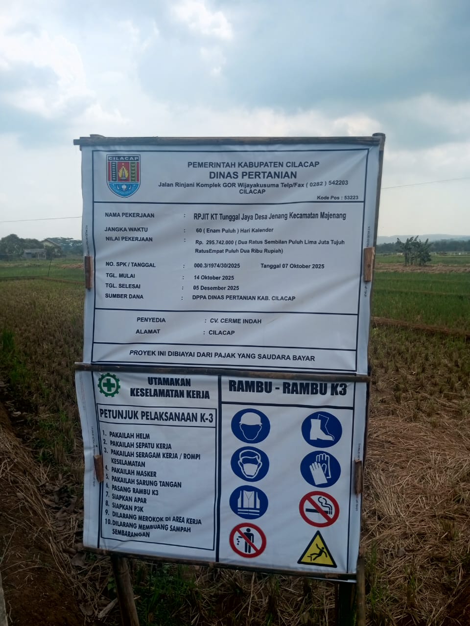 Central Publikasi.Com-Cilacap:Pekerjaan RP JIT KT. Tunggal Jaya Desa Jenang Kecamatan Majenang Kabupaten Cilacap. Pekerjaan nya di kerjakan oleh CV.Cerme Indah dengan Nilai Kontrak sebesar Rp. 295.742.000 diduga keras banyak menabrak aturan.