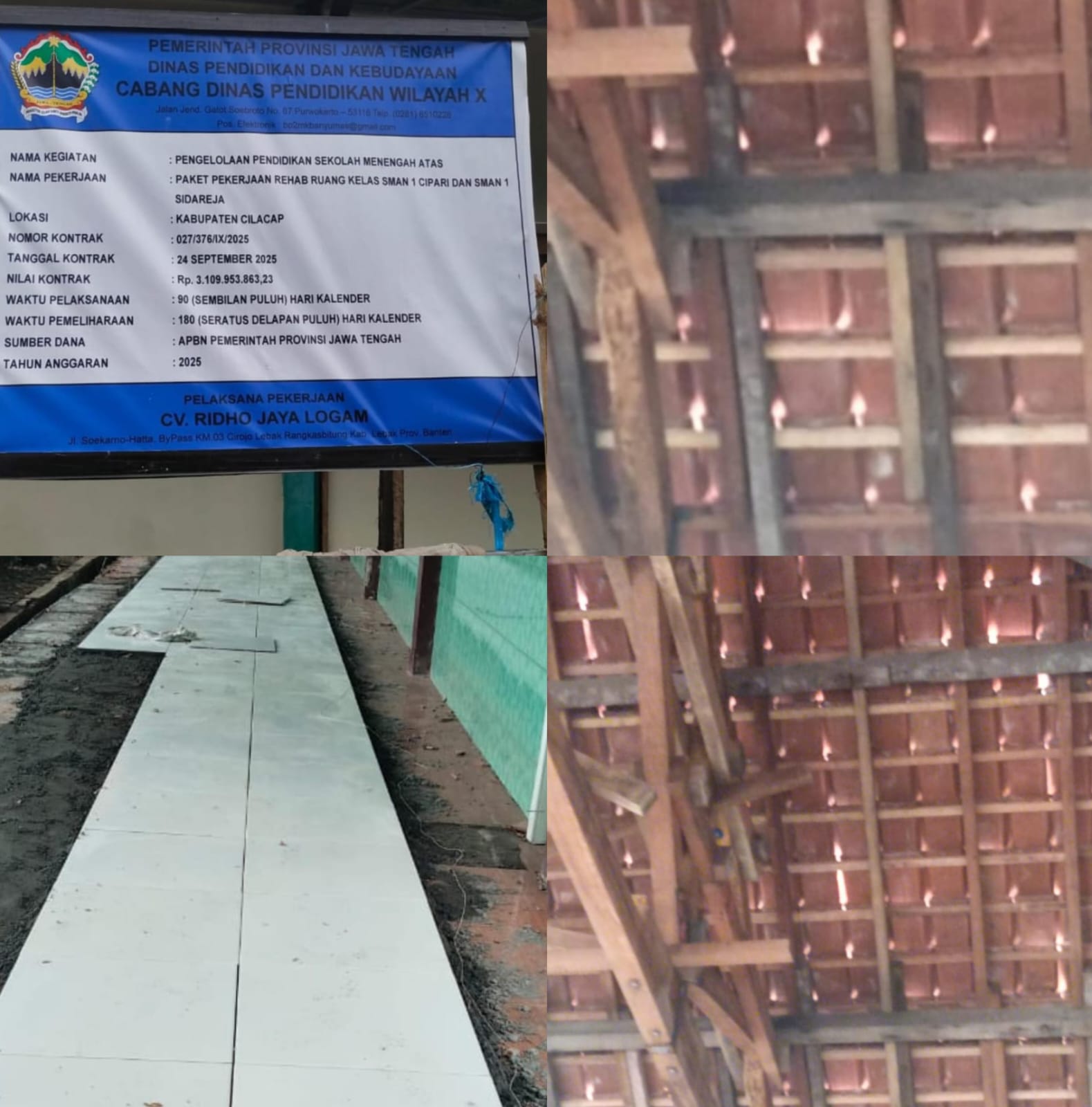Central Publikasi.Com-Cilacap:Rehab Ruang Kelas SMAN 1 Cipari dan SMAN 1 Sidareja dengan Nilai Kontrak sebesar Rp.3.109.953.863,23 yang dikerjakan oleh CV.Ridho Jaya Logam. Yang mana diduga pekerjaan asal-asalan diduga juga 2000 genteng tidak diganti. Dugaan ini timbul setelah tim melakukan kroscek lapangan dan hasil daripada konfirmasi.
