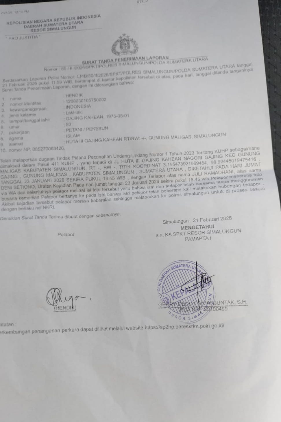Seorang pria berinisial HK (51) warga Huta 2, Gajing Kahean, Kecamatan Gunung Maligas, Kabupaten Simalungun resmi melaporkan dan di duga  selingkuh DS (45) dengan Istri Nya ke Polres Simalungun pada hari Sabtu tanggal 21 Februari 2026 Pukul 15 .30.Wib  terkait kasus perselingkuhan dengan Laporan Polisi Nomor LP/8/80/II/2026/SPKT Polres Simalungun, Polda Sumatera Utara.Senin 23/02/2026